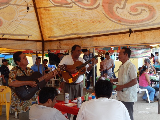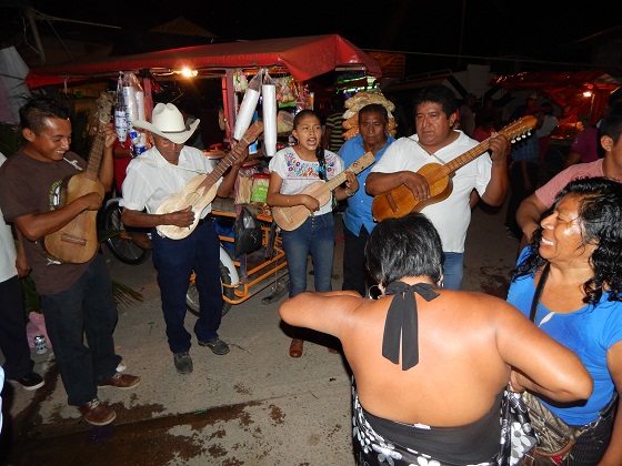 Мексиканские танцы, некоторые из каких характерны только для штата Веракруз, весьма эмоциональные и горячие. В центре освобождается площадка для танца, и туда заходят молодые девушки в традиционных красивых платьях. Вокруг них собирается толпа и гитаристы, играющие все один мотив. Пение по куплету по очереди, а внутри круга идет танец. Потом одних девушек сменяют другие, после чего туда заходят пары уже с парнями. Любой желающий, умеющий танцевать, может сменить в любой момент одного из танцора и встать на его место. Так происходит долго: один и тот же мотив, одну и ту же песню они могут играть минут до 20 без перерыва, после чего начинают заново. Название танца, местные мне сказали, звучит что-то вроде "фортанго", пытался искать в интернете, но конкретно этот танец найти не удалось, есть схожий, но с другим смыслом.