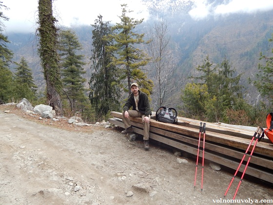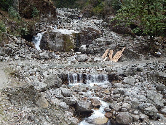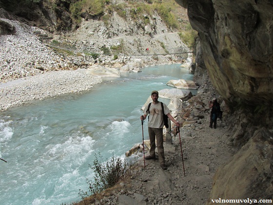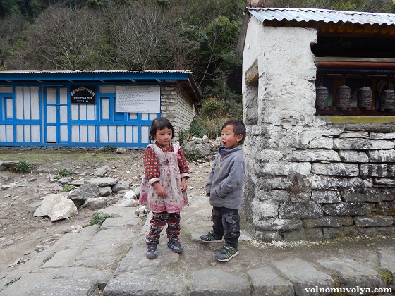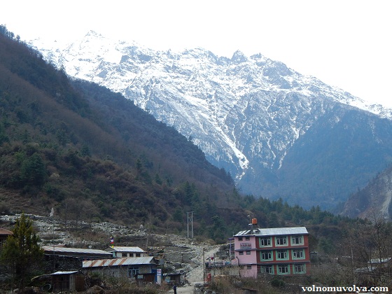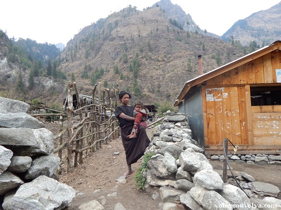 С погодой нам опять везёт - день ясный, настроение - боевое. Идёшь - и не перестаёшь удивляться всем красотам и чудесам гималайской природы. Особенно хорошо смотрятся небольшие уютненькие поселения местных жителей, которые научились хорошо приспосабливаться к рельефу. Они строят свои дома из камня и сооружают их в таких местах, что иной раз тебе даже не верится, что в подобном месте можно построить дом и жить в нём долгие годы. Однако большинство непальских построек на треке так или иначе ориентированы на туристов. С каждым годом турпоток всё усиливается и усиливается, и местные жители строят всё новые и новые гестхаузы и различные вспомогательные постройки, которые потом будут приносить прибыль их семье, а стало быть, этот суровый регион будет продолжать оставаться заселённым людьми.