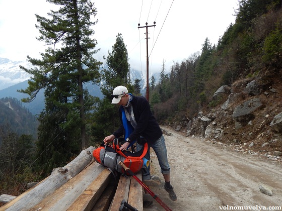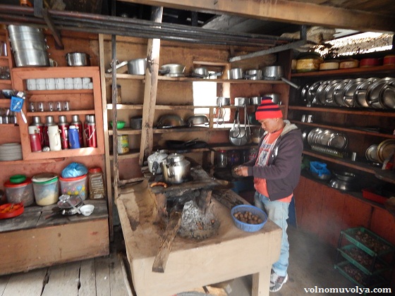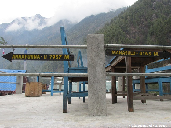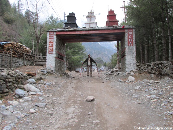 Ну и вот мы, наконец-то, подошли к Чаме. Прошли через знаменитые ворота с молельными барабанами и приступили искать подходящий недорогой гестхауз. Нашли неплохой, с вай-фаем, но цены я сейчас уже не помню. В Чаме нас ночью ожидали первые заморозки и минусовая температура. В столовой вечером местные жители обогревали комнату с помощью бездымного процесса тления углей в железной бочке, что было весьма кстати. Лиц туристического происхождения в этом районном центре наблюдалось уже значительное количество. Американцы, британцы, немцы, израильтяне и прочие французы. Но русских коллег мы не заметили никого, да, впрочем, мы довольно неплохо устали за день и нам было уже не до пустой болтовни по-душам с кем попало, хотя с непальцами мы обмолвились несколькии предложениями на англо-непальском. Пожелали друг другу спокойной ночи (suba ratri) и улеглись в наши кровати. Завтра нас ждал новый день и путь на 3300.