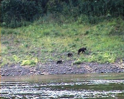 На второй ходке - вновь приятная, экзотическая встреча. На берегу прогуливалась медведица с двумя малышами, сеголетками. До дружной компании было метров 50-60, течение тихо несло байдарку. Сидим, неподвижно держа весла наготове. В случае, если мы не понравимся мамаше и она начнет с нами разборки, успеть дать деру. Семья брела по берегу, а малышня еще затеяла догонялки между собой. Минут 5-7 наслаждались семейной идиллией, снимая её на видеокамеру. Но вот ветер донес до «хозяйки» наш запах. Она замерла неподвижно и довольно настороженно, вглядывалась в плывущее по реке сооружение, дав знак малышам, которые притихли, сразу прекратив свои игры, а потом продолжила свой моцион с медвежатами. Однако, минуты через 2-3 все же решила увести своё семейство с берега, под таежный покров, от греха подальше. Неспеша семейка скрылась в прибрежной тайге.