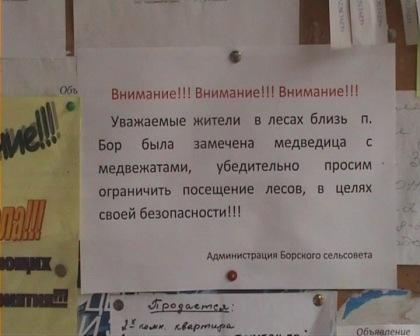 На следующий день в кассе взяли билеты на скоростной теплоход «Красноярск» =2.545 руб. до г. Енисейска. "Казачинский" порог обмелел - и теплоход пройти до Красноярска не может. Плюс билеты на автобус Енисейск - Красноярск = 398 руб. Пошли знакомиться с поселком. Возле центра, на доске информации - листки о купле-продаже движимого и недвижимого имущества. Наше внимание привлекли два расположенных рядом объявления. На одном администрация сельсовета просит жителей ограничить выход в тайгу для сбора грибов и ягод: «Будьте осторожны: в лесу ходит медведица с медвежонком,» - а чуть ниже местных модниц приглашают посетить кабинет «по наращиванию ногтей». Цивилизация !!!