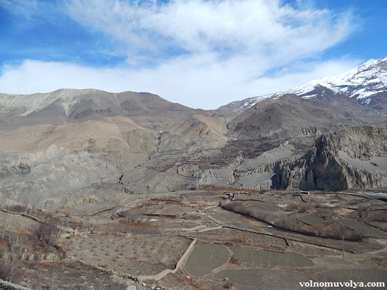 Наутро мы все втроём двинулись дальше. У нас с Алексеем в планах был Джомсом, но Набиль наивно думал, что сможет дойти дальше, до селения Марфа (Marpha). Мы же сразу же ему сказали, что у него не хватит сил на это и что мы снова будем ночевать вместе в Джомсоме. Надо быть реалистами. Пейзажи Мустанга мне нравились почему-то больше, чем пейзажи по другую сторону перевала. Было в них что-то такое необычное и манящее. Вроде бы и пустошь с грудами камней, но, в сочетании с обжитостью мест и трудом местных жителей, долина реки Кали Гандаки представлялась очень живописной.
