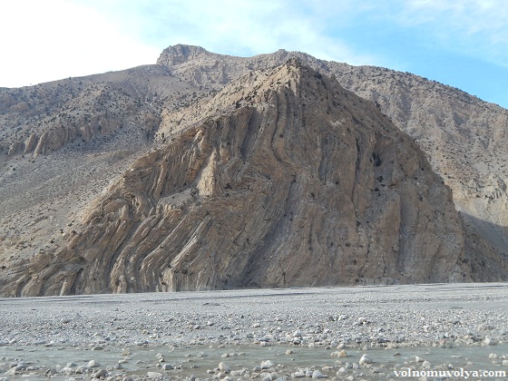 Проходя по береговой дороге, мы с Алексеем заметили очень любопытную вещь. Под ногами с обоих сторон, в срезах грунта и вообще повсюду, было очень много обтёсанных камней. Камни эти напоминали галечник, которого полно на морском или речном берегу. Всё бы ничего, но этот участок дороги находился на высоте около 20-30 метров от русла реки. Да и камни были повсюду: и до этого участка, и дальше. Мы начали выкладывть версии возникновения этих камней на таком участке. Первой версией всегда в таком месте является версия о водном происхождении этих камней, т.е. их намыло водой: очевидно когда-то русло реки доходило до высоких размеров и эти камни обтесало водой; что во времена схода последнего Ледникового периода, когда реки питались из больших ледников, воды в реках было много и русло реки Кали-Гандаки доходило аж до этих краёв. Версия интересная, но она неправдоподобная. Ведь и сейчас в горах ледниково-снежной массы хватает с излишком, а стало быть, почему тогда сейчас нет такого сильного потока (ведь сейчас климат гораздо теплее), а тогда он должен был быть? Значит, это не зависит от размеров ледников.