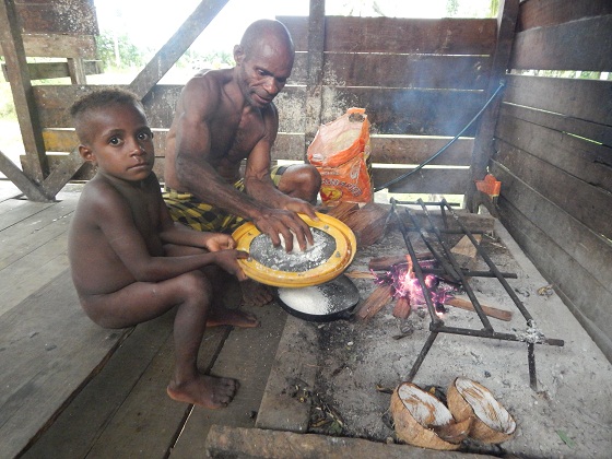 В Амини семья Криса кормила меня жаренным саго и рыбой. А также пичкала меня арбузами и огурцами, которые были великолепны, но их было очень много! И я только успевал бегать в кусты и избавляться от продуктов переработки этой жидкости! Рис они не едят, потому что дорого. Один только проезд сюда стоит 70 кина! Мне, вайтману, разумеется, бесплатно, ибо я - гость.