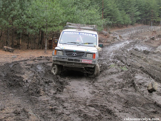 Ясной погоды уже и след простыл, небо затянуло облаками. Мы уже прошли Дарапани, Данакью, Танчок и вышли напрямую до Чаме. Кстати, местные жители говорят "Цаме" - это произношение гурунгов. Но, например, непальцы (горкха) Западной Бенгалии сказали бы "Чаме". Так или иначе, до города оставались уже считанные километры, но мы уже были довольно уставшие и мечтали быстрее дойти до какого-нибудь гестхауза с вай-фаем и остановиться там. Время подходило к 6 вечера, и мы уже прекратили устраивать превалы - надо идти побыстрее, ведь кто его знает, сколько ещё идти. Хотя по карте было немного, но Чаме всё нет и нет. Недавно здесь прошли дожди, и дороги размыты. Идти по грязи не очень то-приятно, а главное, гораздо сложнее. В Танчоке мы делали остановку и перекурили минут 15, заказав себе традиционный тибетский чай. Рецепт его прост: заварка, молоко, масло, соль. Напиток похож на бульон и сильно ощутим вкус соли. Но пить можно, вовсе не противно. К тому же ещё очень бодрит и придаёт сил. А соль в напитке находится для того, чтобы тибетцу не бегать в туалет часто на морозе, так как соль удерживает влагу в организме и не так часто хочется в туалет. В условиях морозных и ветренных Гималаев это проблематично и крайне некомфортно.