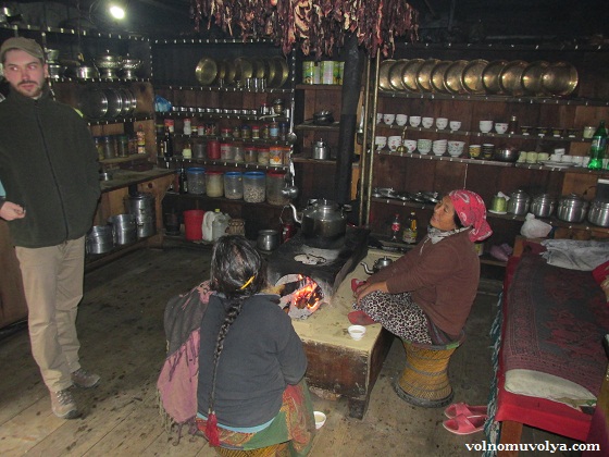 Ну и вот мы, наконец-то, подошли к Чаме. Прошли через знаменитые ворота с молельными барабанами и приступили искать подходящий недорогой гестхауз. Нашли неплохой, с вай-фаем, но цены я сейчас уже не помню. В Чаме нас ночью ожидали первые заморозки и минусовая температура. В столовой вечером местные жители обогревали комнату с помощью бездымного процесса тления углей в железной бочке, что было весьма кстати. Лиц туристического происхождения в этом районном центре наблюдалось уже значительное количество. Американцы, британцы, немцы, израильтяне и прочие французы. Но русских коллег мы не заметили никого, да, впрочем, мы довольно неплохо устали за день и нам было уже не до пустой болтовни по-душам с кем попало, хотя с непальцами мы обмолвились несколькии предложениями на англо-непальском. Пожелали друг другу спокойной ночи (suba ratri) и улеглись в наши кровати. Завтра нас ждал новый день и путь на 3300.