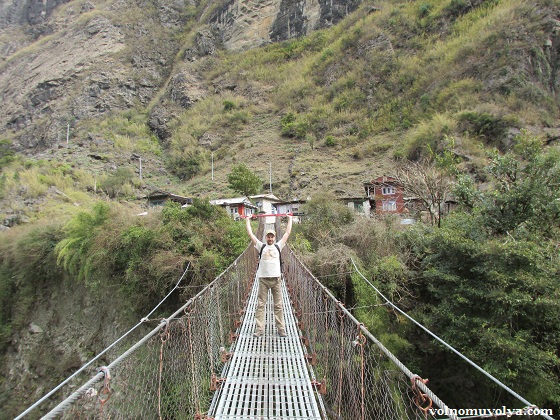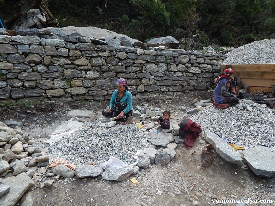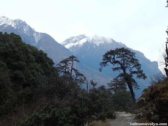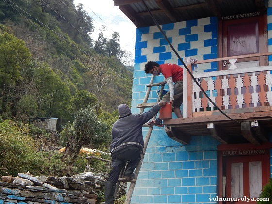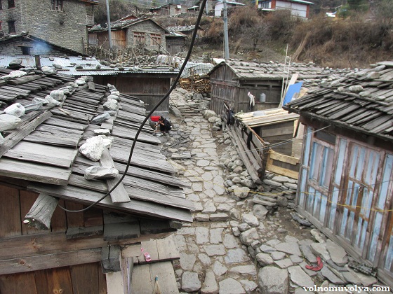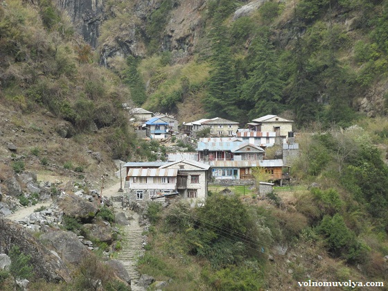 С погодой нам опять везёт - день ясный, настроение - боевое. Идёшь - и не перестаёшь удивляться всем красотам и чудесам гималайской природы. Особенно хорошо смотрятся небольшие уютненькие поселения местных жителей, которые научились хорошо приспосабливаться к рельефу. Они строят свои дома из камня и сооружают их в таких местах, что иной раз тебе даже не верится, что в подобном месте можно построить дом и жить в нём долгие годы. Однако большинство непальских построек на треке так или иначе ориентированы на туристов. С каждым годом турпоток всё усиливается и усиливается, и местные жители строят всё новые и новые гестхаузы и различные вспомогательные постройки, которые потом будут приносить прибыль их семье, а стало быть, этот суровый регион будет продолжать оставаться заселённым людьми.