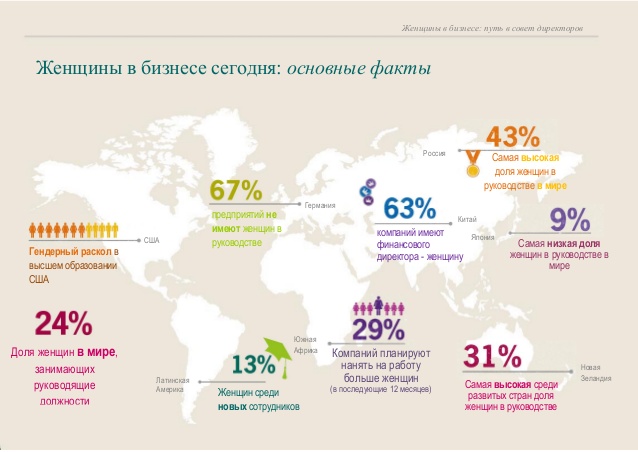 Согласно исследованию международной организации Grant Thornton International, объединяющей аудиторские, бухгалтерские и консалтинговые фирмы, доля женщин среди руководителей компаний в России составляет 43 %, что является самым высоким показателем в мире, почти вдвое выше среднего. При этом среди лидеров рейтинга находятся и другие бывшие союзные республики, в том числе Латвия (41 %), Литва (39 %), Эстония (37 %), Грузия и Армения (по 35 %).