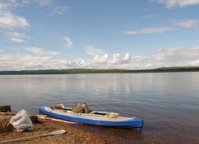 Оверкиль - по-простому, переворот. Метров 400-500 плыли, держась за байдарку и стараясь прижать её к берегу, другой рукой держали гермомешки, что бы их не унесла река. Удалось захватить чалку. Пришлось рискнуть, покинуть байдарку и с чалкой доплыть до берега. Затем, твердо упершись в камни ногами, маятником, на чалке прижать лодку к берегу. Зачалив её, поставили на киль и вытащили все, что не уплыло на берег. Потом стали отчерпывать воду галошами, сохранившимися на ногах, а когда байдарка стала легче, слили часть воды и совсем осушили, перевернув верх дном на берегу. Пока плыли в одежде и потом занимались спасением байдарки, гермомешков, и снаряжения - довольно сильно подмерзли. Распаковали гермомешки, достали фото- и видеоаппаратуру и переоделись в сухое спальное. Немного согрелись. Загрузились в лодку, поплыли на поиски унесенных рекой вещей. До Енисея оставалось 315 км. «НЗ» питания, составлял полбуханки хлеба и две банки консервов. Выживем.